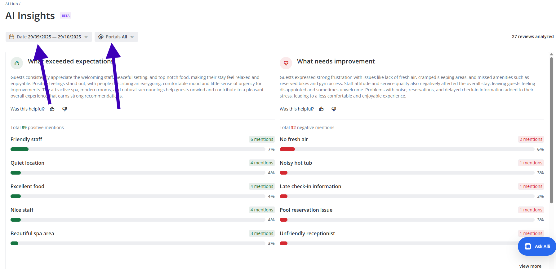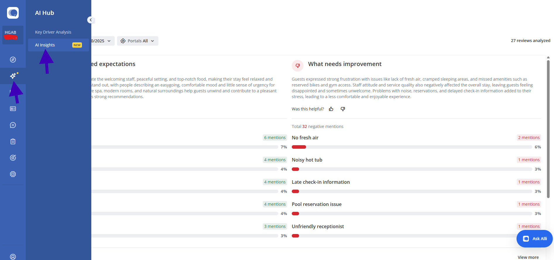 AI Insights is a feature within the Customer Alliance AI Hub designed to help hotel teams automatically analyze guest feedback from reviews and surveys. It transforms large volumes of qualitative feedback into clear, actionable insights, saving hours of manual analysis while revealing exactly what drives satisfaction and areas for improvement.